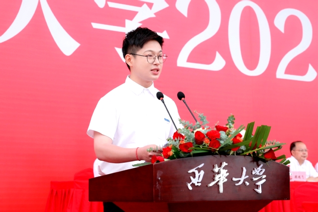研究生新生代表、来自郫都校区的电气与电子信息学院黄鹏同学分享了自己西华本科四年的感想。“我们在最好的年纪来到西华,而西华同样也赐予了我们无限的机会。亲爱的同学们,请告别昨天,它是一张底片,多少遗憾终成回忆;请把握今天,它是一个起点,助我们踏上寻梦的征程。”他号召同学们牢记嘱托,为民族之复兴而读书;笃行实干,为母校之辉煌而读书;坚守底线,为人生之幸福而读书。