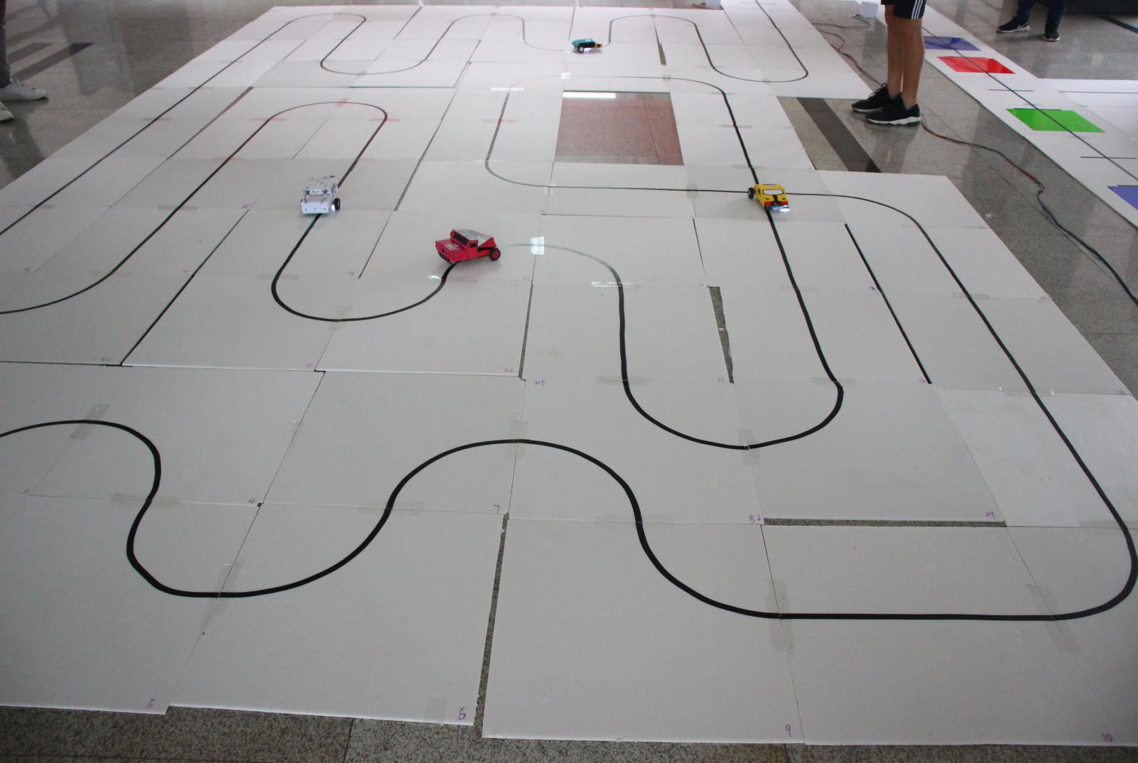 上午8:00,大赛在五教B区大厅正式进行。与初赛相比,本次决赛增加了颜色识别模块,对巡线机器人的速度及灵敏度也有了更高的要求。比赛正式开始前30分钟,各个队伍陆续来到比赛现场对机器人进行最后的调试,每一支队伍都铆足了劲,力求能够将本队机器人的性能展现到极致。赛道上各个机器人你追我赶,可谓精彩十足。