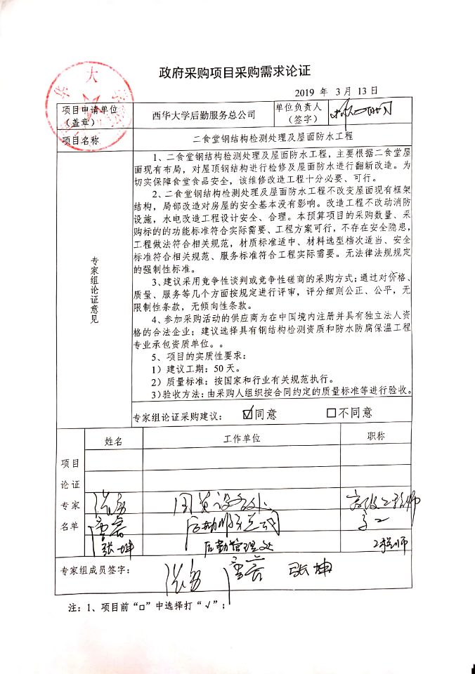 西华大学二食堂钢结构检测处理及屋面防水工程拟采用竞争性磋商方式采购,并组织专家进行了采购需求论证。现将此事项向潜在的政府采购供应商和社会公众广泛征求意见,有关情况公示如下:
