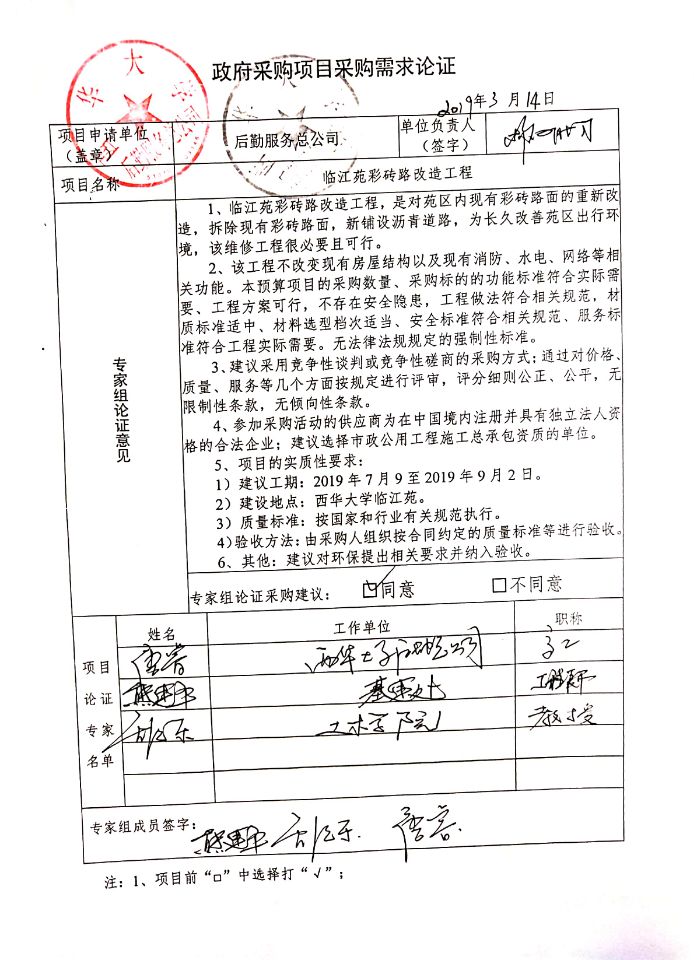 西华大学临江苑彩砖路改造工程拟采用竞争性磋商方式采购,并组织专家进行了采购需求论证。现将此事项向潜在的政府采购供应商和社会公众广泛征求意见,有关情况公示如下: