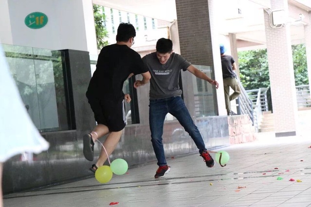“踩气球大比拼”是最令人期待的游戏。每个人在脚上捆绑上两个气球,参赛者相互攻击对方气球,最终还有气球剩余者获得胜利。比赛分为女生组和男生组,在女生组的比赛中,经过激烈的角逐,编辑部的赵鑫玥和采编部的杨亦婷进入决赛。比赛逐渐进入白热化阶段,最后赵鑫玥凭借矫健的身手赢得了比赛,围观干部们都拍手叫好。在男生组的比赛中,摄影部的谭俊雄在大家的呐喊声中凭借脚上剩余的气球获得了最终胜利。主持人为男女生组的最终胜利者颁发了小电风扇作为奖品,游戏环节结束后大家一起对活动场地进行了清理。