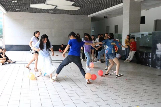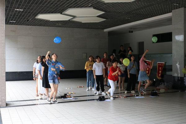 首先,干部们进行了拍气球比赛。比赛开始,第一个人将气球抛向空中,用手拍气球使其处于悬空状态,相互接力使其前进。队员们都在为各自的队伍加油打气。第二组率先传递完成,获得了零食礼包一份。而作为惩罚,最后完成传递的小组为大家演唱了歌曲。