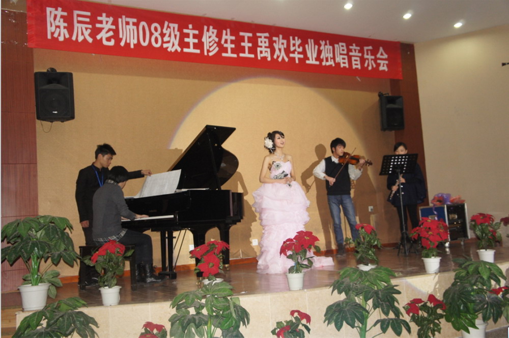 12月16日晚19:30,由艺术学院音乐系主办,声乐教研组承办——王禹欢毕业独唱音乐会在学术交流中心举行。艺术学院常务副院长肖珣,音乐系王育华、赵华强、谢晓芹等师生300余人出席了音乐会。特邀四川音乐学院声乐二系吴雪亮老师担任整场晚会钢琴伴奏。 08级声乐主修生王禹欢,师从艺术学院陈辰、谢晓芹老师、四川音乐学院声乐一系系主任张琳娜教授及声乐二系李晨老师。王禹欢演唱的曲目包括维吾尔族民歌《一杯美酒》、意大利威尔第曲,吉尔达咏叹调《亲切的名字》以及《茶花女》选段《饮酒歌》等。整场高潮不断,赢得了无数叫好声。