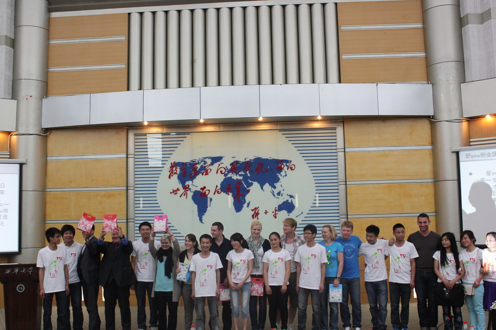 4月28日早上,德国科隆莱茵应用技术大学穆勒教授、法夫教授及随行的8名学生在爱YOU创业团队的迎接下,来我校做友好交流访问。德国师生一行游览了校园,参观了FSAE方程式车队设计室、节能车队工作室和新图书馆等。 下午2:30,四教报告厅座无虚席,德国科隆莱茵应用技术大学文化交流活动正式开始。经济学穆勒教授、媒体经济学法夫教授、西华大学国际合作与交流处的叶林果老师和近400多名学生参加了此次文化交流活动。活动共分两个环节,首先是西华学子分别向穆勒教授和德国大学生请教学术文化问题,然后,德方代表也向我校师生提出他们的困惑。提出的问题涉及学习生活、中德文化、娱乐休闲等方面,内容丰富,形式多样。 一位勇敢自信的西华女大学生就恋爱问题向德国学生Yariu提问,她问道:“德国大学生谈恋爱是倾向于法国浪漫型、美国开放型、中国保守型、还是德国严谨型呢?”此问一出,现场哗然,Yariu笑着回答道:“大多数德国人谈恋爱是严谨的,但还是有例外的。”现场不由地响起了阵阵掌声。在德方提问环节,法夫教授对中国大学生的交友方式很感兴趣,他说他们主要用facebook和朋友们进行沟通交流,“请问在中国大家用什么工具进行交流呢?”“QQ!”报告厅现场的同学们一齐大声地答道。最后,书法协会的三名同学现场写字作画,一株翠竹傲然挺立中央,旁边的宣纸上写着“海内存知己,天涯如比邻”几个苍劲有力的大字,寓意中德友谊源远流长,万古长青。 交流会结束后, 西华大学爱YOU创业团队作为西华大学学生代表向德国师生赠送礼物,合影留念。 通过这次别开生面的文化交流活动,加强了我校与德国科隆莱茵应用技术大学之间的文化交流,增进了两校学生间的友谊,促进了我校校际交流活动的深入发展。 德国科隆莱茵应用技术大学简介: 德国科隆莱茵应用技术大学成立于1956年,1971年接管了科隆职业技术学院,成为北莱茵州唯一一所国家承认的应用技术大学。电气工程、机械制造、经济工程等学科是科隆莱茵应用技术大学的传统强项。该校的经济工程、信息经济、媒体经济、医药经济等新兴专业更是处于全德国的前列。