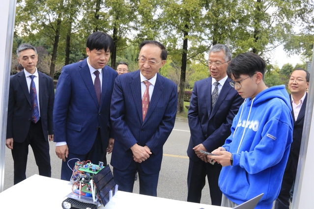 沿着艺术大楼一路行来,林高演先生一行参观了学生科创集市和学校科技成果展。从汽车与交通学院学子设计的纯电动方程式赛车到美术与设计学院学子设计的旅游文创产品,从航空航天学院的新能源电池检漏仪产品设计到食品与生物工程学院的健康营养原浆产品生产技术……来自各个学院的师生科技创新作品和成果,展示了西华人务实、创新、追求卓越的精神。在参观智能空地融合载具及管控教育部工程研究中心装备展时,林先生对中心的各种装备表现出浓厚的兴趣,从产品特色、智能化等方面详细了解无人机的应用前景。参观过程中,林高演先生对西华的校园环境表达了高度赞美,对丰富多彩的学生活动和让人耳目一新的科技创意赞不绝口,鼓励同学们积极创作,全面发展,对这些科研作品的未来充满期待,认为大家在西华大学读书是在享受非常美好的人生。