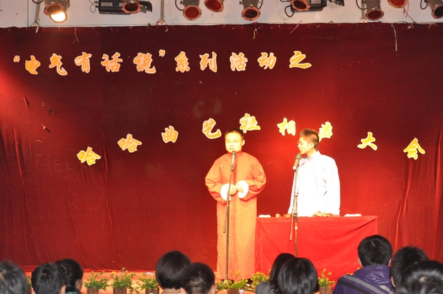 9月24日晚7:00,由电气信息学院分团委主办的“电气有话说”系列活动第十期“哈哈曲艺社相声大会”在学生活动中心隆重上演。著名相声演员丁宝祥先生,省体团第七频道主持人谢雷朋及电气信息学院2010级全体新生到场观看了表演。来自哈哈曲艺社的相声演员们为观众们带来一桌丰盛的相声大餐。 伴随着哈哈曲艺社演员们表演的开场唱,晚会正式开始。《劫刑车》、《夸住宅》等节目赢得了台下观众的阵阵掌声,现场气氛十分热烈。《论捧逗》、《山东二簧》及由丁宝祥先生和于洋小朋友表演的《蛤蟆鼓》更是将晚会气氛推向了高潮。节目的最后,丁宝祥先生为活动现场题字。伴随着热烈的掌声,相声大会圆满结束。 相声作为中国的一项文化传统,历史悠久。本次相声大会带来的不仅是听觉上的享受,更是对西华学子们进行的一种传统文化熏陶。