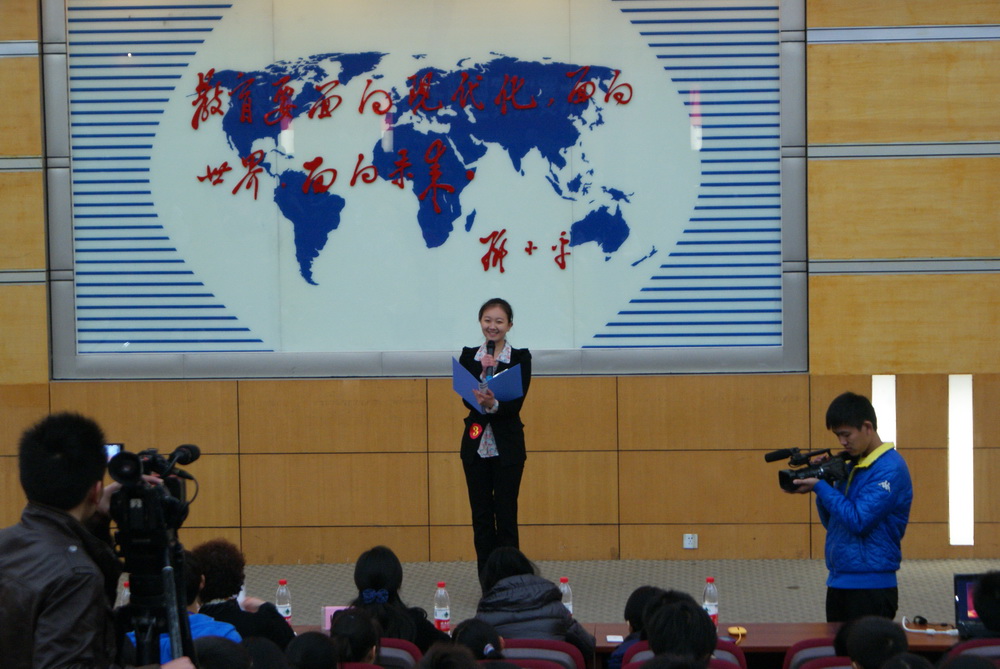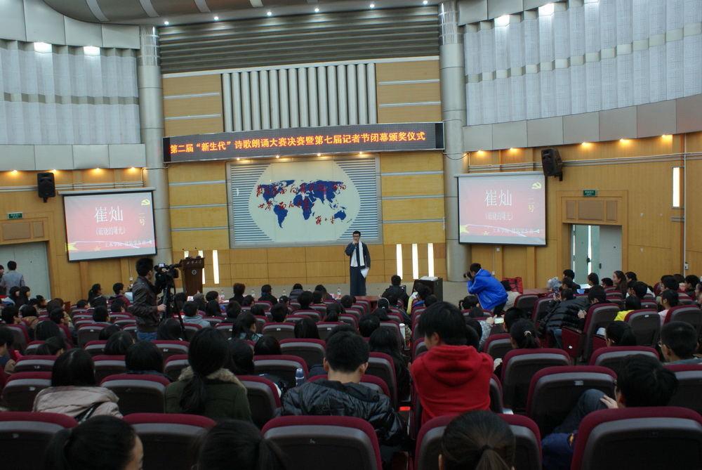 “当雄鸡在那遥远的东方高唱的时候/中华民族腾飞的捷报一定会频频传扬/中国人民一定会用自己的智慧和汗水/去铸就明天的辉煌!” 伴随着饱含深情的音乐,11月23日中午12:00,在1号选手李思琪朗诵的《中国梦》中,第二届“新生代”诗歌朗诵大赛决赛在四教报告厅拉开了序幕。党委宣传部副部长山述兰以及党委宣传部的各位老师担任本次大赛的评委,西华大学学生传媒中心六大社团的同学们也现场观看了本次比赛。 建筑与土木工程学院的崔灿同学,一身青色长衫,脖子上挂着白色丝巾,一个20世纪初的青年知识分子形象打扮吸引了大家的眼球。他情绪高涨、激情澎湃,举起手高声朗诵道:“要喊醒这深睡的大地,要喊亮这漆黑的天,要唤起四万万同胞站起,要喊碎这个旧世界,要把实现共产主义作为终生的誓言。”使现场的观众仿佛置身于那个烽火连天的年代中,一首诗歌将中国共产党从诞生到发展壮大的光辉历程深刻展现。 经济与贸易学院的张胜航同学朗诵的是余光中先生的诗歌《春天 遂想起》,更是将那种故乡情结、爱国情怀展现得淋漓尽致。他声音里充满了感情,眼里含着热泪,以至于最后那句“站在基隆港,想——想,想回也回不去的,多燕子的江南”,几乎是带着哭腔朗诵出来的,现场响起了热烈的掌声。 随后,艺术学院何怡静给大家带来了《祖国啊,这诗意的名字》,管理学院钱泓睿带来的则是《青春中国》,艺术学院李艳的《祖国颂》等同学的朗诵也依次亮相,篇篇诗歌凝聚着对党的深沉情怀,句句诗词洋溢着对祖国的美好祝福。 最终,张胜航凭借其饱含深情的朗诵获得了本次比赛一等奖;徐姝莹、钱泓睿获得了本次比赛的二等奖;何怡静、黄艳、范元琳获得三等奖。 之后,进行了第七届记者节闭幕仪式暨颁奖典礼。党委宣传部的老师们对校园“十佳记者”、“十佳新闻”、“十佳网络传媒人”颁发了奖状,并为各大社团参与学生传媒中心素质培训的同学们颁发了结业证书。 最后,党委宣传部副部长山述兰对本次比赛做了总结讲话。她希望大家能够在新闻素养、新闻敏感度、视野、文字、摄影等多方面有所提升。 本次诗歌朗诵大赛,是歌颂中国共产党光辉历史的的活动,激励同学们要敢于挑起肩上的责任,努力学习,完善自我,将深深的爱国情感转化为追求卓越的动力。