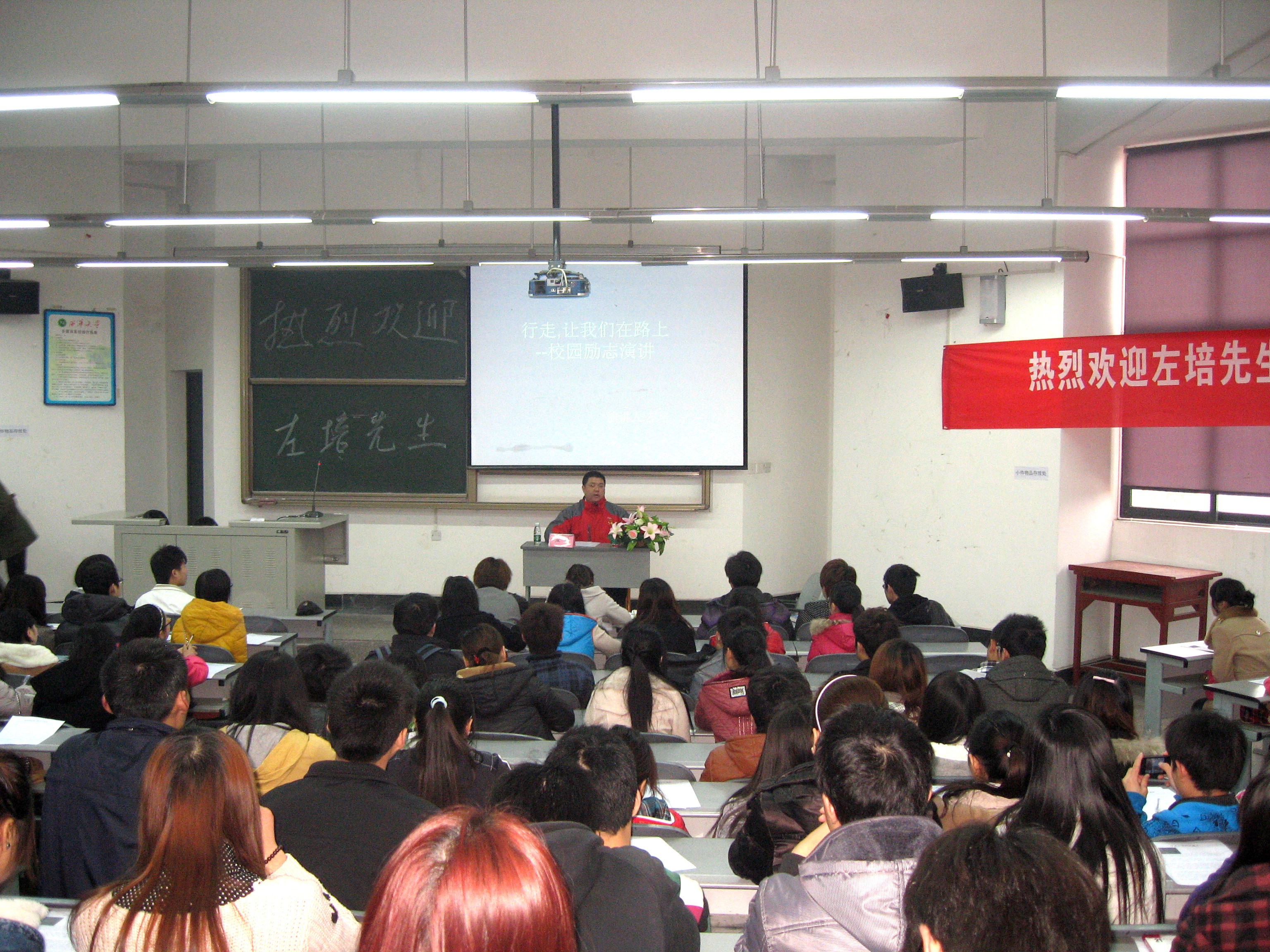 3月14日中午12:00,管理学院在6B-201开展了第十六期“管理•下午茶”活动,著名作家左培先生做客下午茶。本次校园励志演讲由共青团西华大学委员会主办,管理学院团委承办。演讲以“行走,我们在路上”为主题,以让同学们拥有良好的心态并树立崇高的理想为目的,面向全校师生,开展了一次深刻的思想道德教育。 左培先生深情并茂地阐述了自己的观点,他认为,在竞争日渐激烈的当代社会,唯有一种良好积极的心态和一种锲而不舍的精神才是我们勇往直前的动力和不败的法宝。左先生一再强调,每个人都要有一颗感恩的心,要懂得奉献,懂得回馈社会。车祸致残已伴随他走过了17个春秋,他也从一个懵懂的小孩长大成人。虽然他已经残疾,但是他的心,他的意志并没有因残疾而消沉,仍然对自己充满信心。左培先生精彩的演讲深深地打动了在场的每一位同学,大家无不为左培先生的高贵精神所折服。 接下来是现场访谈问答,大屏幕开始播放短片《新生的17个年头》。伴着柔和的旋律,左培老师再度登台,开始了与同学们的互动交流。同学们纷纷举手提问,在这个过程中,左先生多次提到自己的母亲:“我的妈妈非常伟大,她从未放弃过我,一直鼓励我,支持我,是我的妈妈支撑我走到今天!” 此次活动让同学们了解到左培先生身残志坚的事迹,对于同学们树立信心,形成不怕挫折与磨难,勇于面对困难、战胜困难的意志力起到了积极的促进作用。 链接: 左培,成都市作家协会会员、成都市作协文学沙龙“每月十五”成员、网络义务交通员、阳光家园残疾人庇护工场老师。7岁时的一场车祸使左培失去了三分之一的脑髓,给他的左手、左脚造成了不可逆转的伤害。但他凭借坚强的毅力奇迹般地活了下来,并在追求理想的路上不断收获成就感。 代表作:《妈妈,您好》、《一份温暖,一份感动》、《卖唱的小女孩》、《苏醒》、《走向冬天的背后》等。 讲座现场