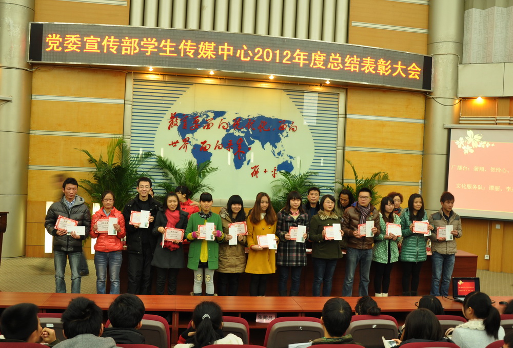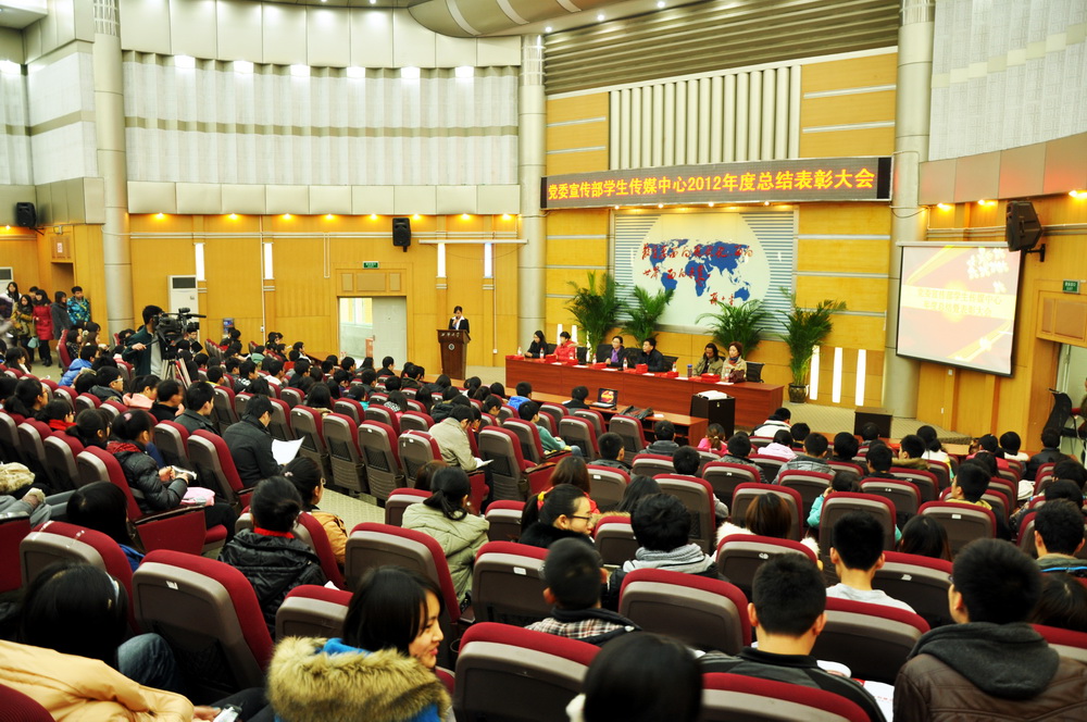 12月21日12:35,党委宣传部学生传媒中心2012年度总结暨表彰大会在四教报告厅隆重举行。党委宣传部部长张力、副部长山述兰及部门工作人员与学生传媒中心六大兄弟社团的同学们共同参与了此次总结表彰大会。