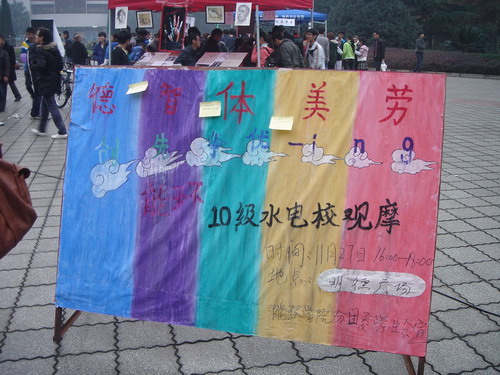 | 11月27日,能源与环境学院2010级水利水电工程专业组织的团观摩活动在明德广场举行。活动以“一起来找德、智、体、美、劳”为主题。能源与环境学院学生会主席团、校团委组织部和各兄弟学院组织部成员以及2010级水电专业的学生参加了活动。 活动突破了学校团观摩活动传统的晚会模式,创新性地采用了户外活动的方式。活动按照主题分成德、智、体、美、劳五个版块,各版块设置了丰富多彩的游戏。活动开始前,全体到场人员齐唱团歌,2010级水电专业的同学带来了太极、古筝弹奏等精彩才艺表演,表演结束后各个板块的活动也同时开展。最受同学们欢迎的是“劳”版块的快乐厨房和“智”版块的下棋比赛。到场同学积极参加各种游戏,并从中收获了很多。最后,本次趣味横生的团观摩在一场激烈而又精彩的问答比赛中圆满结束。 本次活动充分体现出“创先争优”思想对大学生的领航作用,让同学们充分认识到了“创先争优”精神的重要性。同时也让大学生开始重视全面发展自我;开始从德、智、体、美、劳五个方面去锻炼自己,提高自己的综合素质。