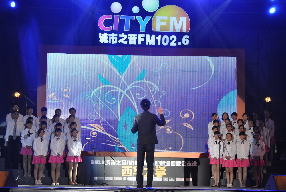 10月24晚7点,体育馆座无虚席,由四川人民广播电台城市之音FM102.6主办,西华广播台young radio承办的“2012城市之音FM102.6校园迎新巡回晚会走进西华大学暨西华广播迎新晚会”在此隆重举行。城市之音著名DJ林林、刘旭和西华广播台DJ邹冀、严雯佳担任此次晚会的主持人。城市之音联播网四川台副总监徐文欣先生和2000余名西华师生共同分享了此次视觉盛宴。本次晚会是城市之音第七次走进西华。 晚会在安迪舞蹈团的街舞《oppa Andy style》中拉开序幕。接着,一曲《江南style》引发现场首次高潮。之后,著名歌手潘玮柏、胡夏、吴克群等艺人通过视频向我校学子问好,并纷纷表示,希望我校学子能够在新学期取得新的收获,渡过有意义的大学四年。 此次晚会的节目形式多样,有舞蹈、合唱、表演唱、独唱、配音、诗歌朗诵、cosplay秀等多种方式,多角度地展现了我校学子的青春与活力。节目现场,无论是性感妩媚的爵士舞《school dream》,还是清新甜美的大合唱《野百合也有春天》,都引来在场观众的阵阵掌声。接着,充满磁性的歌曲串烧、感悟季节的诗歌朗诵《四季恋歌》、超凡脱俗的苗族舞蹈《水姑娘》、演绎唐宋盛世儿女情仇的古装cosplay秀《剑侠情缘3》等相继亮相,现场掌声雷动,场面气氛异常活跃。特别是在由西华广播台带来的英文配音《马达加斯加3》中,五位外文部播音员纯正标准的英语口音让同学们惊呼不可思议。另外,在游戏互动环节中,主持人还走进观众席和同学们进行趣味问答,引发笑声不断。最后,有多位幸运观众分别获得自行车、国色天香年卡和中国移动3G手机等精彩大礼。 “大家好,我是潘辰!”,作为本次晚会的特邀嘉宾潘辰亭亭站立在舞台中央,亲切地向观众打招呼。她带着自己的全新同名专辑《潘辰》与同学们见面,为大家倾情演唱了新专辑中《更爱》、《渡口》、《因为爱》、《起风的季节》等歌曲,掀起了晚会的又一高潮。 在我校艺术学院教师陈辰的男生独唱《追寻》中,晚会完美谢幕。本次晚会让同学们有了和自己喜爱的明星近距离接触的机会,现场感受音乐的魅力,丰富了同学们的校园文化生活。