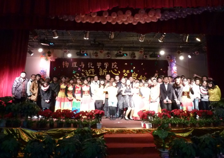 12月16日19:00,物理与化学学院“以心迎新 心梦起航”迎新晚会在学生活动中心举行。学院分党委书记黄继红、院长冯灏、分党委副书记兼副院长李欣、副院长马梦林以及学院党政办公室、教学办公室、学生工作办公室老师和200多名新生一同观看了晚会。