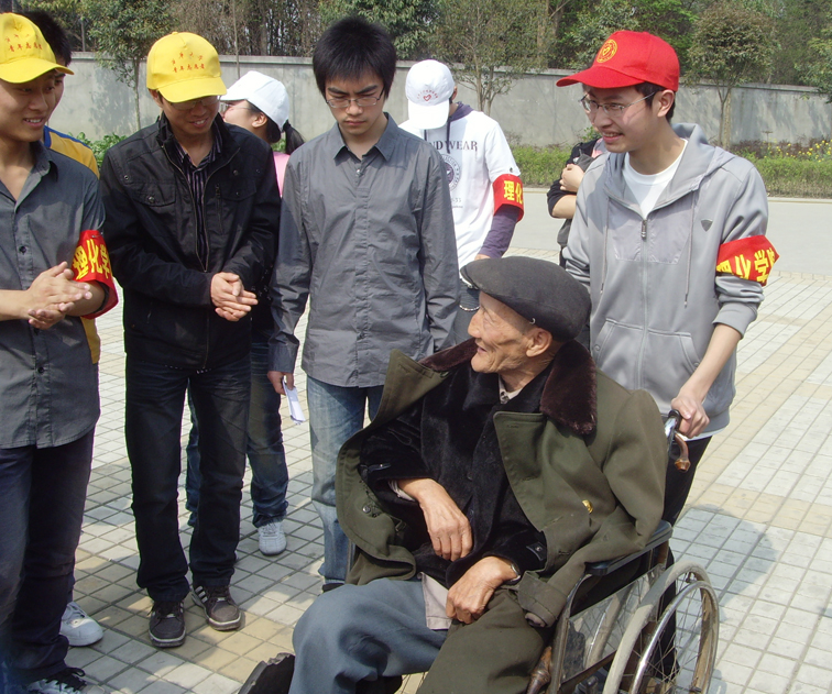 3月20日,物理与化学学院、外国语学院和材料科学与工程学院志愿者服务队联合开展了“向雷锋同志学习,让爱走进敬老院”的爱心活动。 志愿者服务队一行50余人怀着满心的期待,来到郫县团结镇敬老院。此时的敬老院,去除了昔日的宁静,充满了欢声笑语与青春活力,久违的笑颜重新绽放在了老人们写满沧桑的脸上。一声声“爷爷”、“奶奶”,让他们倍感温馨与幸福。志愿者们牵着爷爷奶奶的手,听他们诉说着,和他们交谈着,开启他们心中那扇尘封记忆的大门,让青春的阳光驱除他们心中晦涩的记忆。民歌、小品、朗诵、葫芦丝、双节棍等精彩的表演,博得了老人们的阵阵掌声。