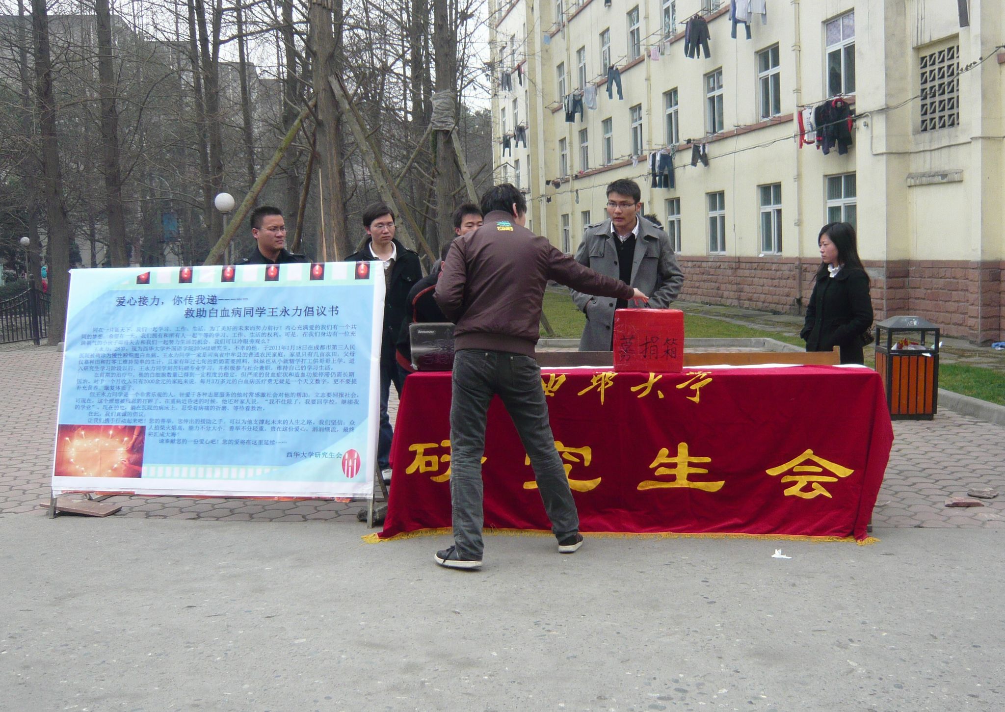 | 3月9日—13日,我校研究生会为白血病患者、外国语学院2009级研究生王永力同学组织了爱心募捐活动。日前,研究生会将5天募得的12972元送到王永利同学手中。 爱心募捐活动得到了全校师生及各界人士的广泛关注。募捐人士中,有在校的老师和同学,也有路过的职工家属和学校周边的居民,从年仅五岁的小朋友到年过七旬的老人,爱心不论身份,关爱不分年龄,一时间,爱的暖流汇聚了整个校园!活动中,部分捐款人士在捐款后还在研究生会准备的心形红纸写下对王永力同学的祝福和鼓励。一位子弟校小学三年级的小男孩用稚嫩的小手认真写到:“哥哥,早日康复!”。部分同学在捐款后还主动留在了募捐点,和研究生会成员一起裁剪心型红纸,为募捐活动出力。这一幅幅感人的画面,在春意盎然的校园里谱写了一曲爱的乐章! 募捐活动中,研究生会成员积极响应“爱心接力,你我传递”的口号,利用休息时间到募捐现场值班,部分成员甚至一整天都在募捐现场,默默地为王永力同学的康复贡献自己的一份力量!