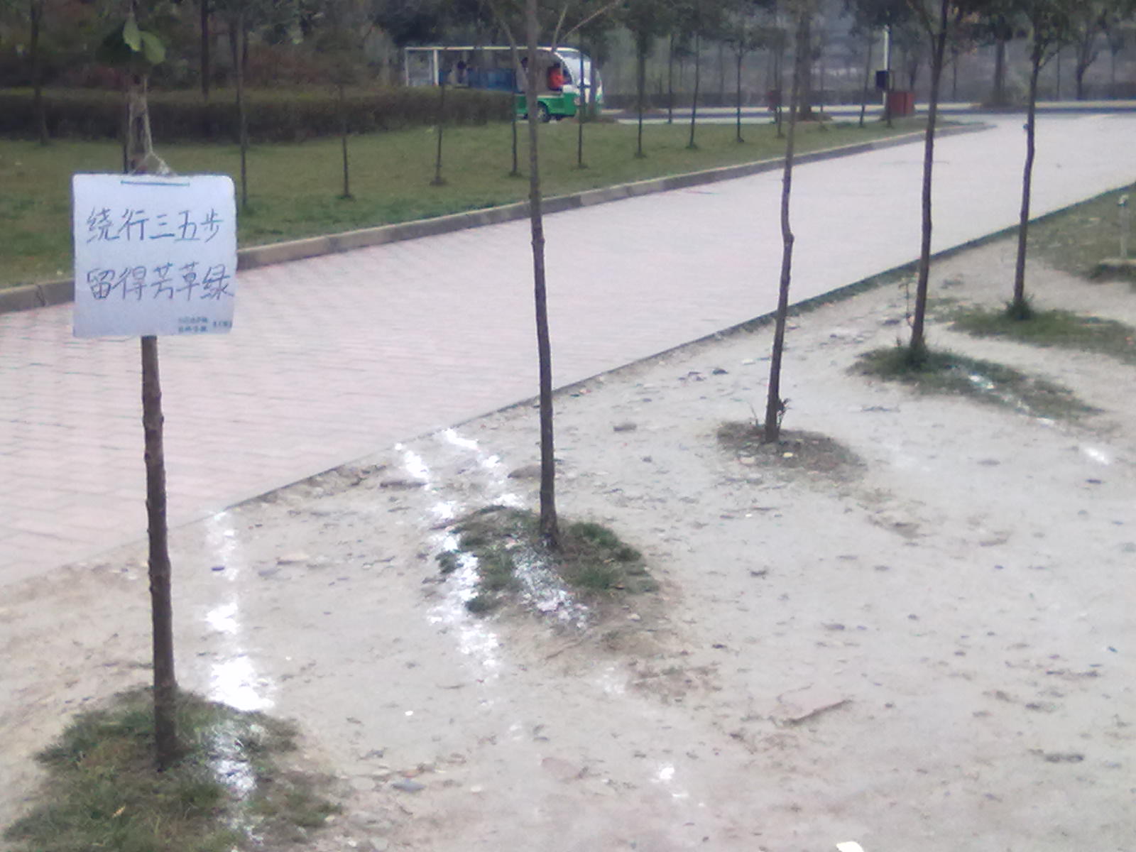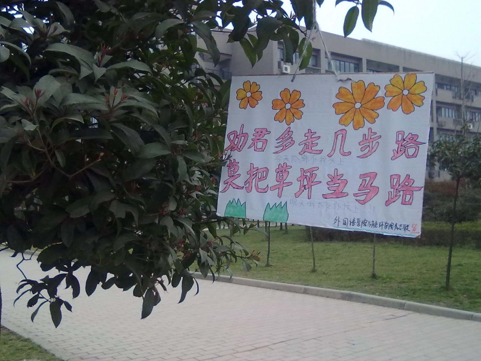 阳春三月,草长莺飞,又是一年植树节。近日来,我校外国语学院和能环学院的同学组织了“爱护草坪,珍惜绿色”系列活动。在我校第五教学楼与西华湖之间的草坪上,竖立多块标语,并组织同学们为小草“站岗”,宣传植树爱绿的相关理念 。