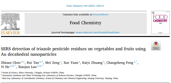近期,理学院表面增强拉曼光谱团队(何毅、罗晓俊、吴彩骏等)在分析化学领域Top期刊Sensors and Actuators B: Chemical(SCI一区,IF:8.4),食品科技领域Top期刊Food Chemistry (SCI一区,IF:8.8)和材料科学领域Top期刊ACS Applied Materials & Interfaces (SCI二区,IF:9.5)上发表研究论文4篇。何毅和罗晓俊老师为论文通讯作者,西华大学硕士研究生谭锐、张润滋,四川大学研究生陈治男做了大量科研工作,同时该成果还得到了南京大学和四川省不对称合成与手性技术省重点实验室的大力支持和协助。