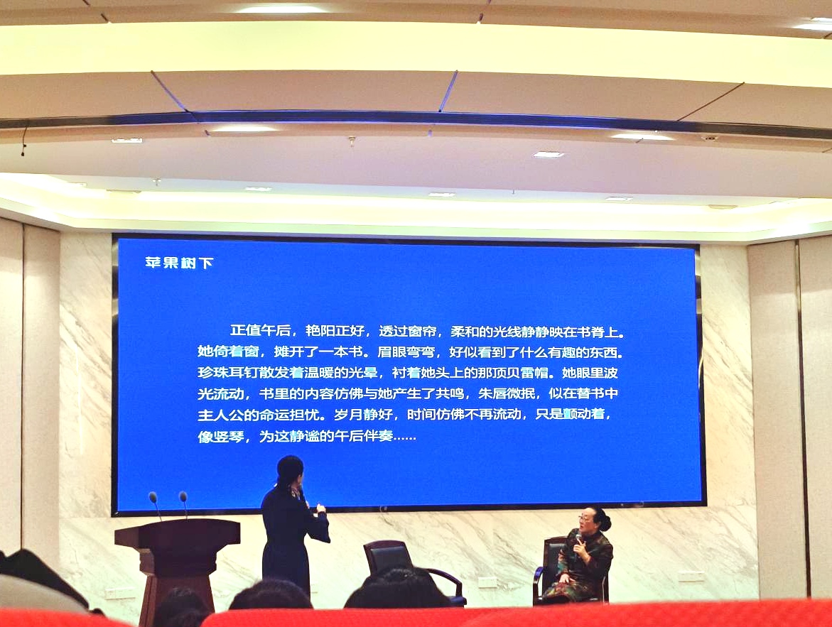 苹果树下培训学校创始人伍苹校长代表评委进行大赛点评。她肯定了同学们以朗诵的形式使文字变得生动形象起来,赞赏了参赛选手们的写作与朗诵能力。她与全体同学分享自己在鲁院的学习经历,就“写作”这项工作,提炼了四句话——阅读是根基;思想是核心;创新是亮点;语言是原点。就朗诵舞台展示方面,伍苹从着装、仪态、站位等细节处为同学们提供了十分切实的改善建议。这位从“苹果树下”走进西华校园的和蔼校长不仅走进了同学们的视野中,也走进了同学们的心里,大家对晚上的作家“教会学生如何写作”的圆桌对谈升起了更强烈的期待。据悉,今后文新学院与苹果树下培训学校将在写作教学和整本书阅读研究领域有更多专业交流与合作。