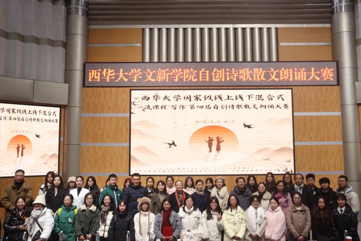 12月21日下午,西华大学国家级线上线下混合式一流课程“写作”第四届自创诗歌散文朗诵大赛在四教报告厅完满落幕,苹果树下培训学校校长伍苹老师,学校教务处副处长刘雪梅、人事处李红梅老师,文学与新闻传播学院院长潘殊闲、院党委副书记徐攀、副院长王学东、副院长范佳,中文系系主任王燕飞、副主任蒋林欣等担任比赛评委。文新学院2023级辅导员陈柄志老师、任焦阳老师、毛雪花老师和2023级写作教师李晓华教授、王万洪教授、王国巍老师全程指导,现当代文学专业研一学生叶星怡、陈星羽、刘明霞、黄璐作为“写作”课程助教也全程联动。汉文一班何蓉、汉文二班陈思霏、汉语国际教育一班陈柳彤担任学生评委。