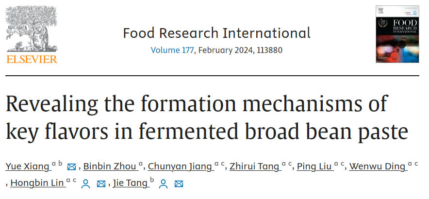 近日,食品与生物工程学院“发酵调味品科学与工程”团队在农林科学领域1区TOP期刊《Food Research International》 (Q1, IF:8.1)发表题为“Revealing the formation mechanisms of key flavors in fermented broad bean paste”的研究性论文。西华大学2021级硕士研究生向粤为论文第一作者,川渝特色食品重庆市重点实验室林洪斌副教授和食品微生物四川省重点实验室唐洁教授为论文通讯作者。该研究工作得到了四川省科技厅重点研发项目(2020YFN0151,23ZDYF3100)的支持。