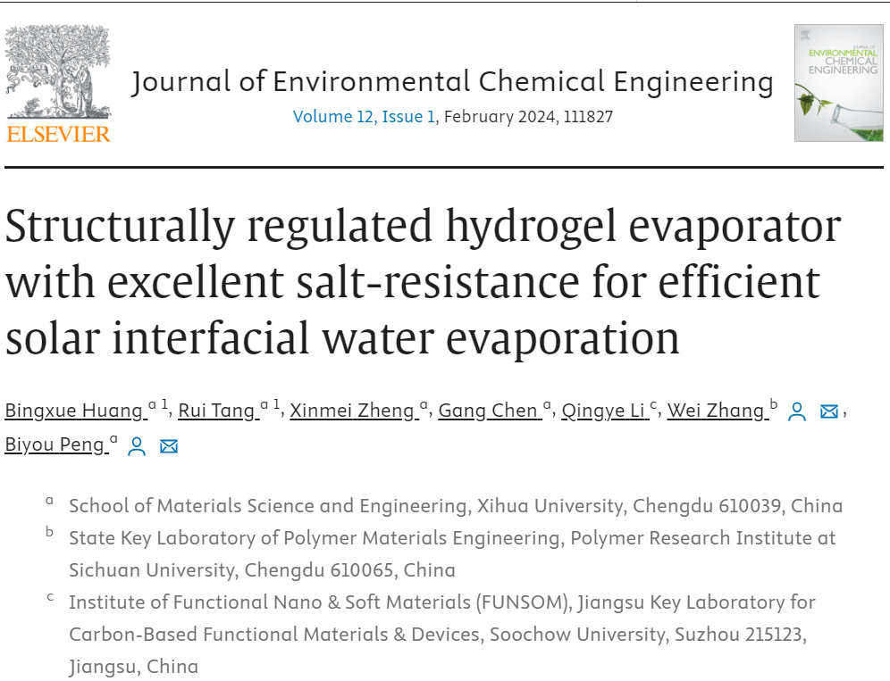 近日,材料科学与工程学院彭必友教授团队在国际一流的环境化学工程学报杂志Journal of Environmental Chemical Engineering(Q1,IF: 7.7)发表题为“Structurally regulated hydrogel evaporator with excellent salt-resistance for efficient solar interfacial water evaporation”的研究论文。黄冰雪博士、研究生唐锐为论文的第一作者,四川大学高分子材料工程国家重点实验室张伟教授、西华大学材料科学与工程学院彭必友教授为通讯作者。该项研究工作得到了四川省科技厅重点研发项目(Grant Nos. 2022YFG0366; 2023NSFSC04430)的支持。