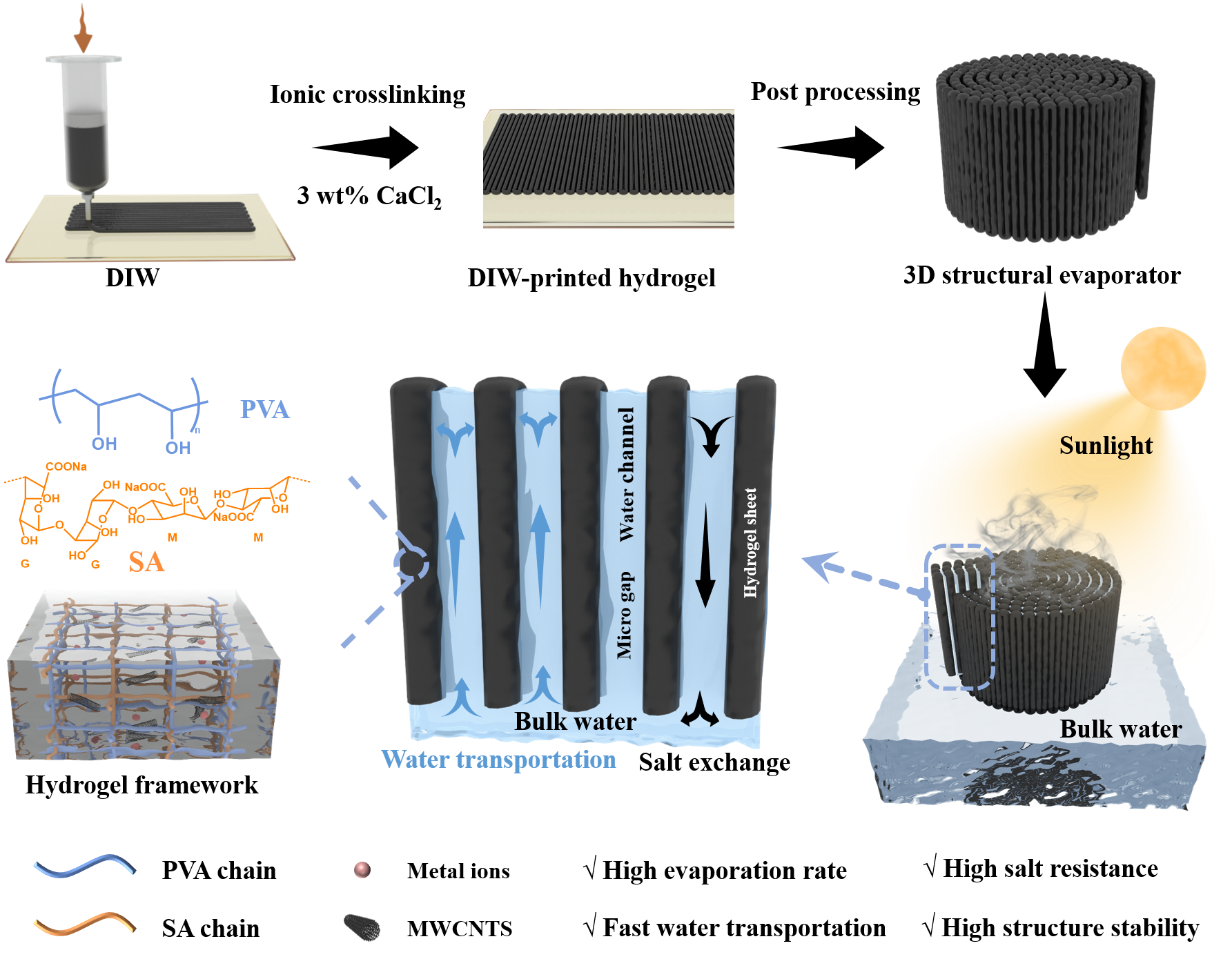 鉴于此,团队基于自研的新型直写3D打印平台,开发了三维结构化光热转换水凝胶材料,并以其为基础构建了太阳能蒸发器。该研究成果可广泛应用于海水淡化领域。得益于3D打印技术在水凝胶基体中构建的连通水体和蒸发面的微通道结构,项目所构建的太阳能蒸发器具有优异的水传输效率,表现出了高效且稳定的水蒸发效率(3.2 kg m-2 h-1)和优异的环境耐受性能。不仅如此,3D打印技术构建的微通道还提供了大量的传质空间,为蒸发后浓缩水体的排出提供了充足的通道,因此基于此所构建的太阳能蒸发器在高浓度盐水和污染废物中依然能够保持其优异的水蒸发性能,展现出了良好的应用前景。