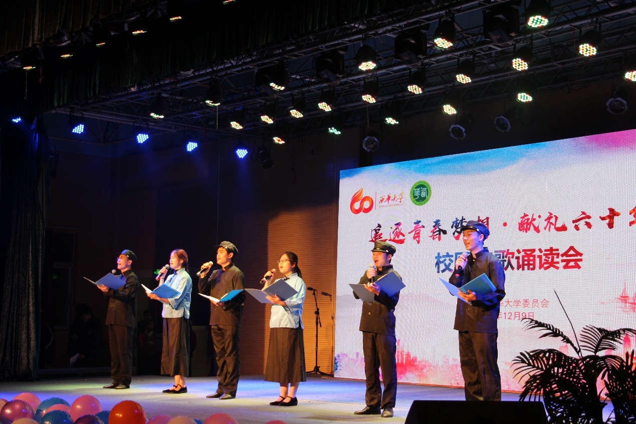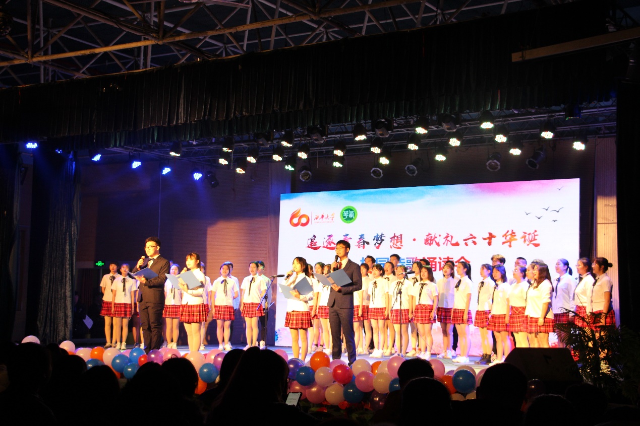 为提高学生的爱国爱校意识,增强学生的民族责任感和自豪感,营造朝气蓬勃、积极向上的校园文化活动氛围,献礼60周年校庆,校团委于12月9日在学生活动中心开展了以“追逐青春梦想·献礼六十华诞”为主题的校园诗歌诵读会,校团委全体老师和各学院团委书记、学生代表参加了本次诗歌朗诵会。