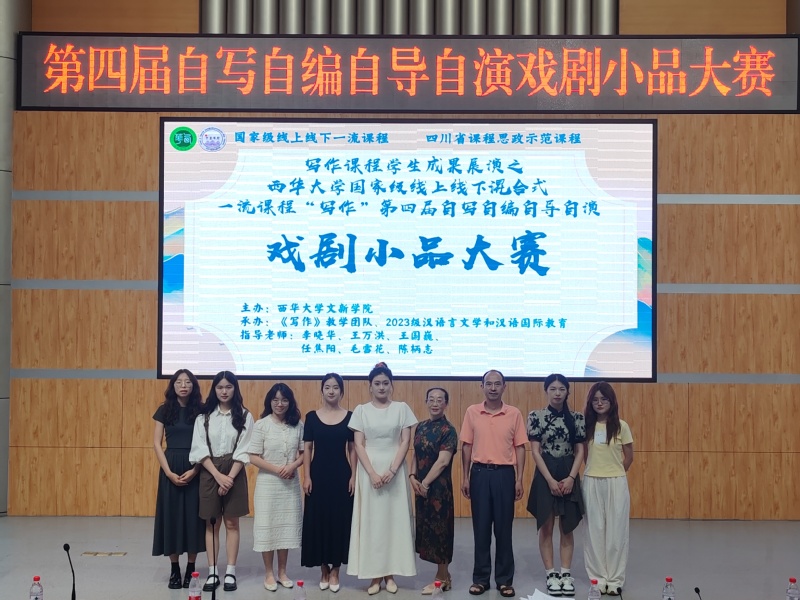 6月18日下午,由文学与新闻传播学院精心筹划并主办的第四届《写作》课程戏剧小品大赛在四教报告厅拉开帷幕,一场洋溢着青春活力的文化盛宴由此开始。此次大赛不仅是我校《写作》课程——这一国家级线上线下混合式一流课程及四川省课程思政示范课程的最新成果展示,也是对学生们文学创作能力与表演才华的集中检阅。学院党委书记张雯欣,院长潘殊闲,教务处副处长刘雪梅,学院党委副书记徐攀,副院长王学东、范佳,人事处李红梅博士,中文系系主任王燕飞、副主任蒋林欣,办公室主任杜昊静,以及活动指导老师到场指导。