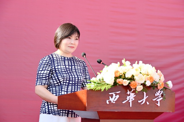 马克思主义学院教师江静作为教师代表发言。她希望同学们牢记西华校训,在新征程上努力践行:求是是治学之基,明德是立身之本,卓越是立业之要。她表示,今天暂时的离别是为了将来更好地相聚,希望同学们在强国建设、民族复兴的新征程上,有最远大的抱负、最出彩的青春,争做国之栋梁。