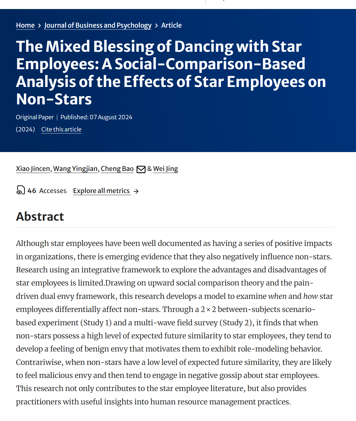 近日,管理学院教师肖金岑课题组在SSCI一区期刊《Journal of Business and Psychology》发表了“The Mixed Blessing of Dancing with Star Employees: A Social-Comparison-Based Analysis of the Effects of Star Employees on Non-Stars”。该论文依托于肖金岑教师获批的教育部人文社科青年基金,旨在系统性地对组织管理中的“关键少数”——明星员工的混合效应进行研究,目前已产出一篇CSSCI和二篇SSCI论文。本篇论文由课题组内的研究生和校外合作者共同参与完成。