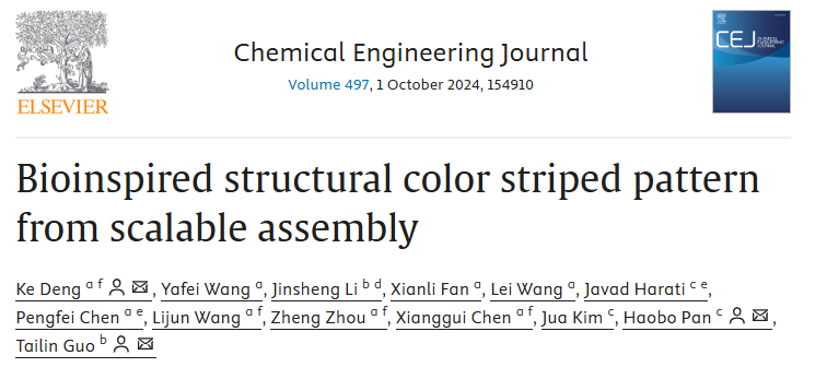 近日,我校食品与生物工程学院食品营养与安全团队青年教师邓科博士在国际Top学术期刊《Chemical Engineering Journal》 (Q1, IF: 13.2)发表题为“Bioinspired structural color striped pattern from scalable assembly”的研究论文。邓科博士为该论文的第一作者及通讯作者, 2022级硕士研究生王亚飞为该论文的第二作者,西华大学为第一通讯单位,陈祥贵教授等团队老师为本研究工作提供了重要指导和帮助。中国科学院深圳先进技术研究院潘浩波研究员和西南交通大学郭泰林教授为该论文的共同通讯作者。
