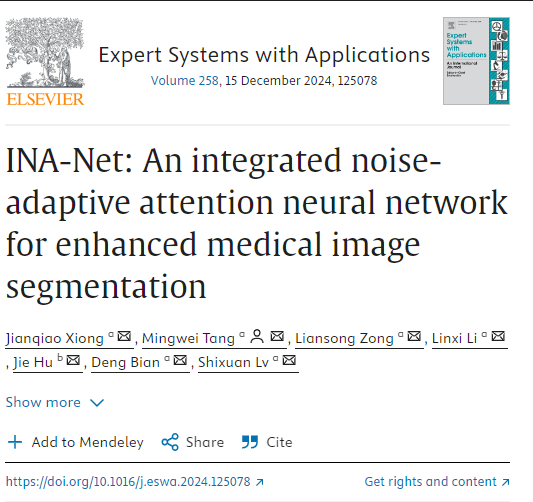 论文3:INA-Net: An Integrated Noise-Adaptive Attention Neural Network for Enhanced Medical Image Segmentation在国际顶级学术期刊《Expert Systems with Applications》上发表。该期刊是中科院SCI分区一区,TOP期刊。论文第一作者为2022级研究生熊健乔,研究生指导老师为宗莲松副教授,通讯作者为唐明伟教授。