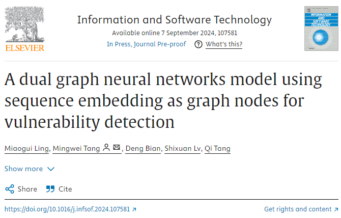 论文6:A Dual Graph Neural Networks Model using Sequence Embedding as Graph Nodes for Vulnerability Detection的研究论文在国际顶级学术期刊《INFORMATION AND SOFTWARE TECHNOLOGY》上发表。论文第一作者为研究生凌苗桂,通讯作者为唐明伟教授。