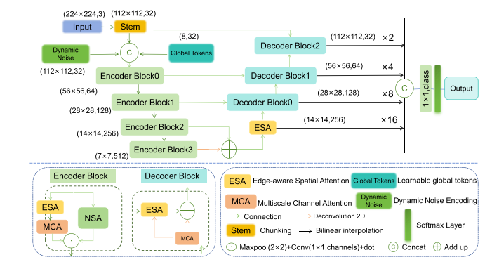 本文提出了集成噪声自适应注意力神经网络INA-Net,创新性地引入了轻量级的噪声-距离注意模块,有效结合局部和模拟噪声特征与全局信息,提高了对复杂混合噪声的鲁棒性。同时,边缘感知空间注意力(ESA)和多尺度通道注意力(MCA)模块的加入,进一步增强了特征信息和边界感知。此外,动态噪声编码模块和傅里叶小波分析(FW-Parser)通过处理高频噪声分量,提高了分割的准确性。实验结果表明,INA-Net在处理毛发干扰、血管闭塞和模糊病变边界等方面具有显著优势,为准确识别皮肤病变提供了关键支持。