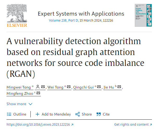 论文4:A vulnerability detection algorithm based on residual graph attention networks for source code imbalance (RGAN)在国际顶级学术期刊《Expert Systems with Applications》上发表。论文第一和通讯作者为唐明伟教授,第二作者为研究生唐威。