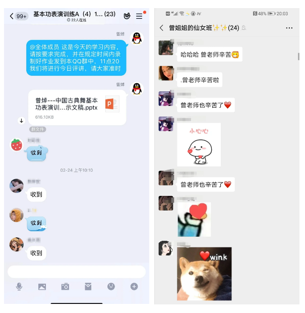 一天下来,舞蹈表演专业2018级的微信群画面是这样的:开课前老师的温馨提示,开课时的点名签到,课堂中的要求任务,课后作业的督查、点评、交流与鼓励,还有同学们给曾焯的感谢与比心。