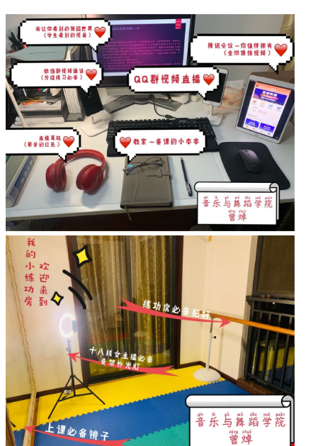为了保证教学的流畅,曾焯将电脑进行了升级,尝试各类直播平台软件的使用方法,根据专业特性,因课制宜选定了“知到教师、QQ群、微信群、腾讯会议”等直播APP,采购了直播支架、补光灯等网络设备。精心录制舞蹈动作视频和制作PPT文稿,提前发到群里让学生预习。
