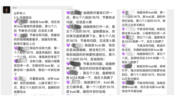 上课时,曾焯会通过点名、连麦问答,或者指定学生展示动作等方式加强课堂管理,让学生全部参与进来。为了更好的保证上课效果,曾焯会在知到APP和QQ群中发出分段讲解和完整版的视频,方便学生课前预习和课后复习,并且学完一个组合后会在QQ群视频讲解需要改进和注意的方面,还会指定一位同学进行示范,请另一位同学指出做示范的同学存在的问题。在基本功练习时,曾焯会清晰地罗列出同学需要做到的程度。