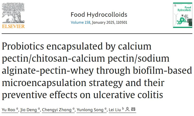 近日,我校食品与生物工程学院饶瑜教授团队与兰州大学刘蕾青年研究员团队联合在国际食品Top期刊《Food Hydrocolloids》(Q1,IF: 11.0)发表题为“Probiotics encapsulated by calcium pectin/chitosan-calcium pectin/sodium alginate-pectin-whey through biofilm-based microencapsulation strategy and their preventive effects on ulcerative colitis”的研究性论文。