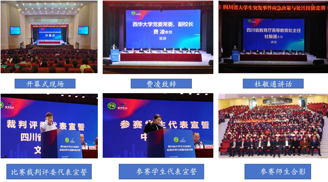 开幕式上,西华大学党委常委、副校长费凌表示希望通过学科竞赛平台,加强全国应急管理专业的交流与合作,共同探索应急管理专业建设新模式和人才培养新途径。四川省教育厅高等教育处杜敏通在讲话中指出,举办应急类学科竞赛对于激发同学们对应急管理学科的兴趣和热情,锻炼同学们在应对突发事件时的决策能力、组织协调能力和实际操作能力方面的重要现实意义。四川省红十字会文盖老师、中国矿业大学陈雨婷同学分别代表裁判和参赛学生进行宣誓。