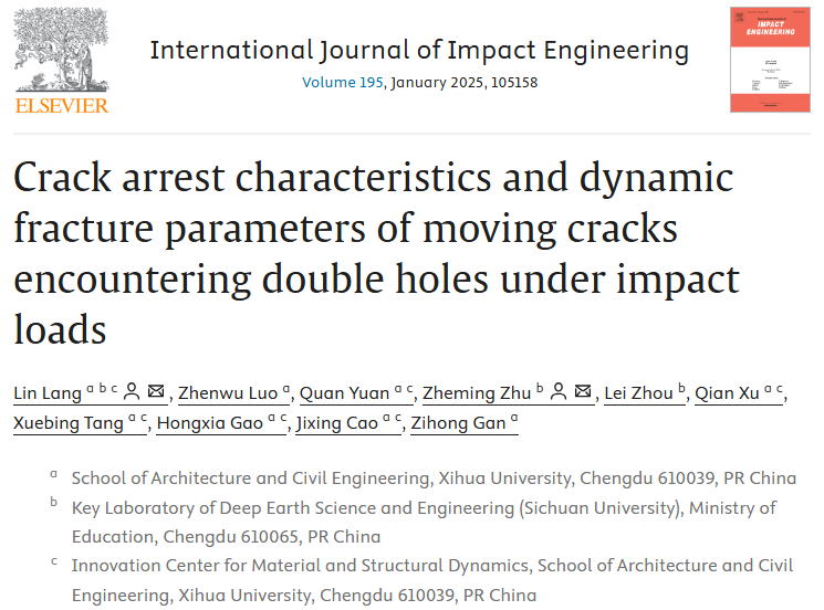近日,建筑与土木工程学院力学教学部郎林副教授在国际力学领域顶级期刊《International Journal of Impact Engineering》发表题为“Crack arrest characteristics and dynamic fracture parameters of moving cracks encountering double holes under impact loads”的研究论文。该论文以西华大学为第一单位和通讯单位,郎林副教授为论文的第一作者,2023级土木水利硕士研究生罗镇武为第二作者,郎林副教授和四川大学朱哲明教授为共同通讯作者。