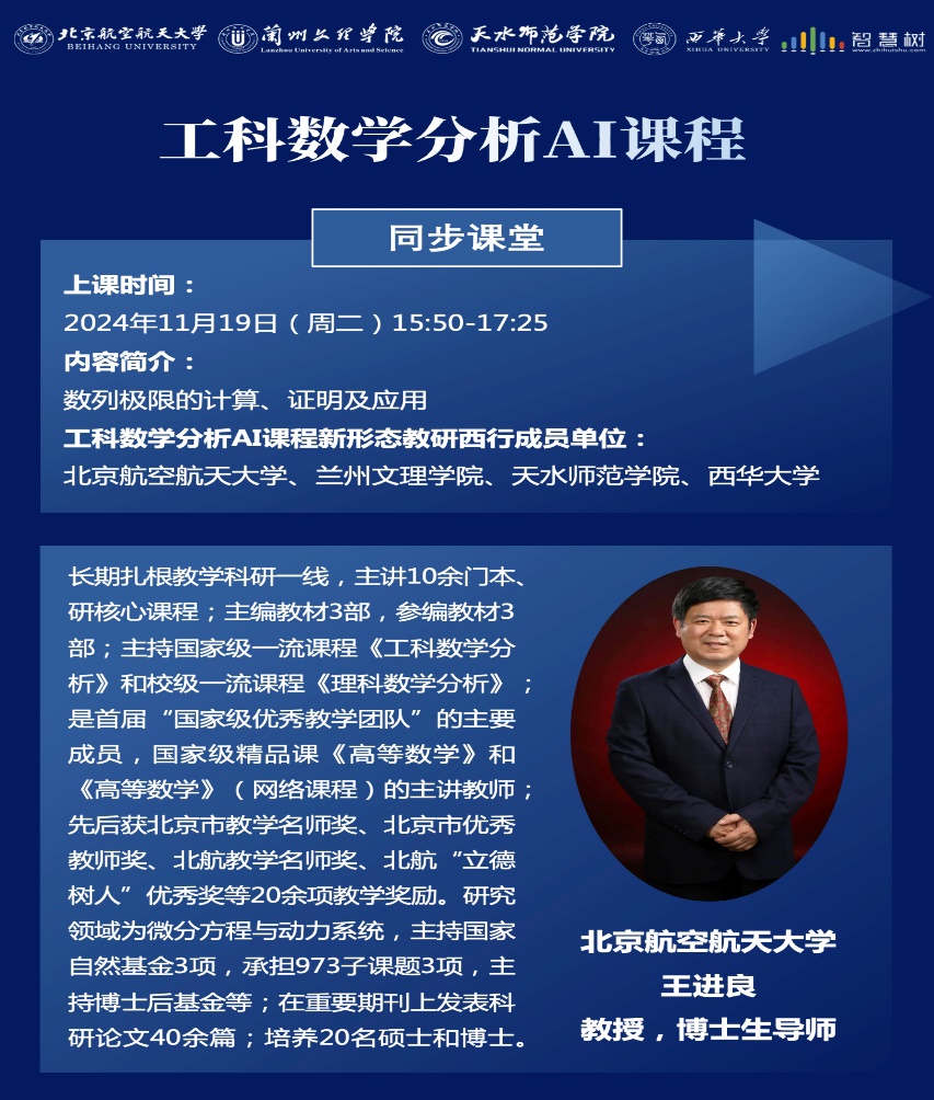 据悉,本次课堂以“数列极限的计算、证明及应用”为主题,由北京航空航天大学、兰州文理学院、天水师范学院和西华大学联合举办,旨在通过人工智能技术与数学教育的深度融合,推动数学教学改革。由北京航空航天大学教授王进良担任主讲人,围绕数列极限的计算、证明与应用进行了系统的讲解。