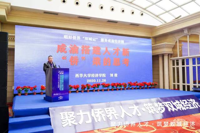 在嘉宾主旨演讲环节,九三学社四川省经济委副主任、九三学社西华大学委员会副主委、西华大学经济学院副教授刘俊以《成渝搭建人才新“侨”梁的思考》为题进行了主旨演讲,刘俊分析了在成渝地区双城经济圈这一重大历史机遇下,侨界如何发挥自身优势,切实把国家战略转化为发展实效的新路径。四川省区域经济研究会会长、西南交通大学区域经济与城市管理研究中心主任戴宾教授以《深化国家重大区域发展战略认识争取国家重大生产力布局》为题,重庆市侨联副主席、西南大学学术委员会副主任、张自力以《用好侨界力量,促进成渝数字经济发展》为题,也分别进行了主旨演讲。