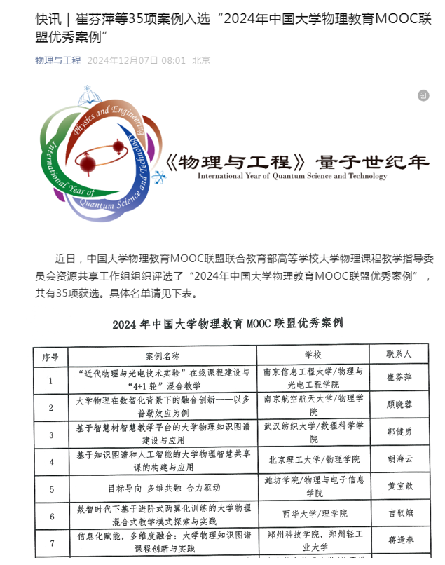 理学院大学物理教学案例入选“2024年中国大学物理教育MOOC联盟优秀案例”