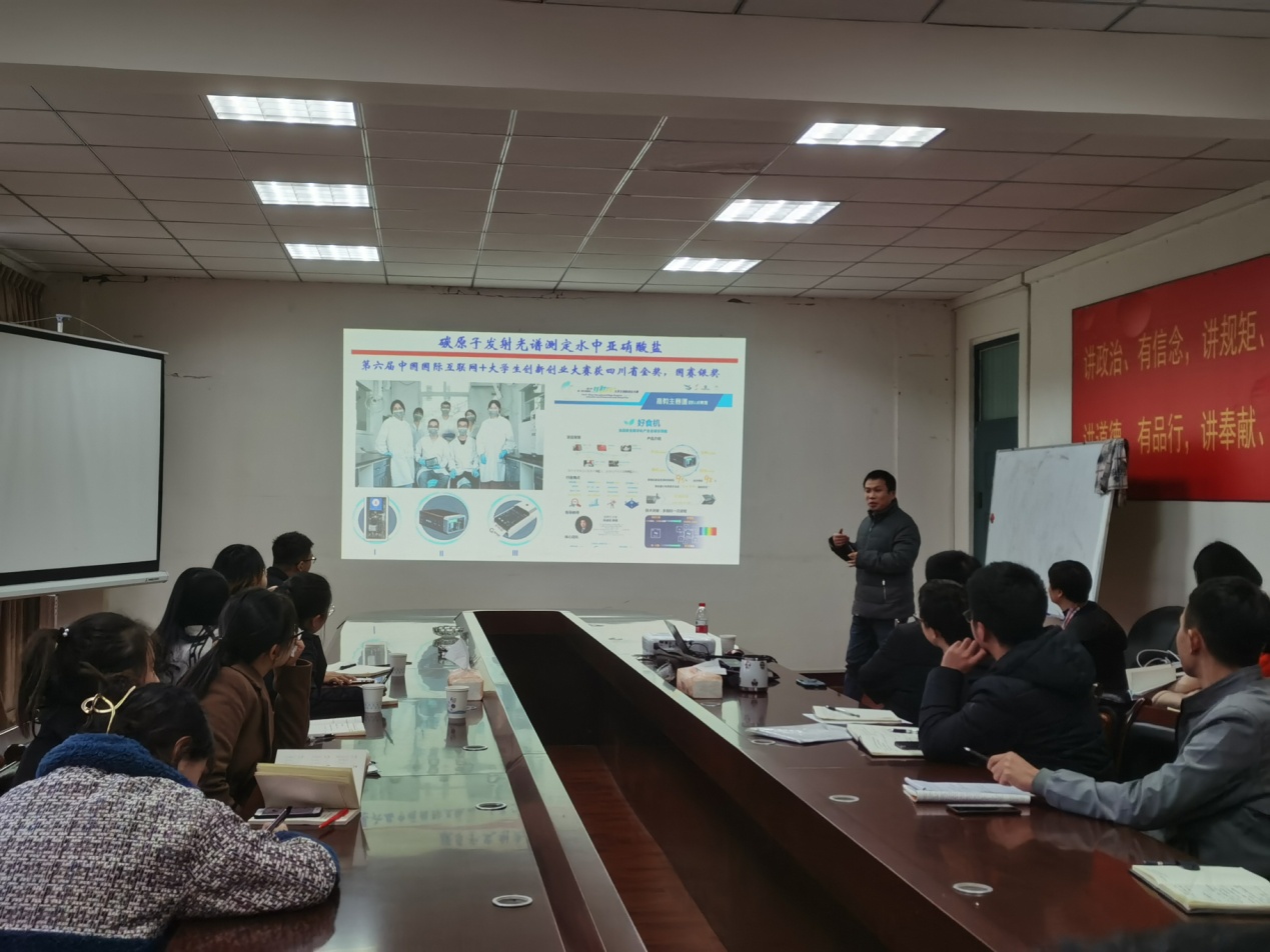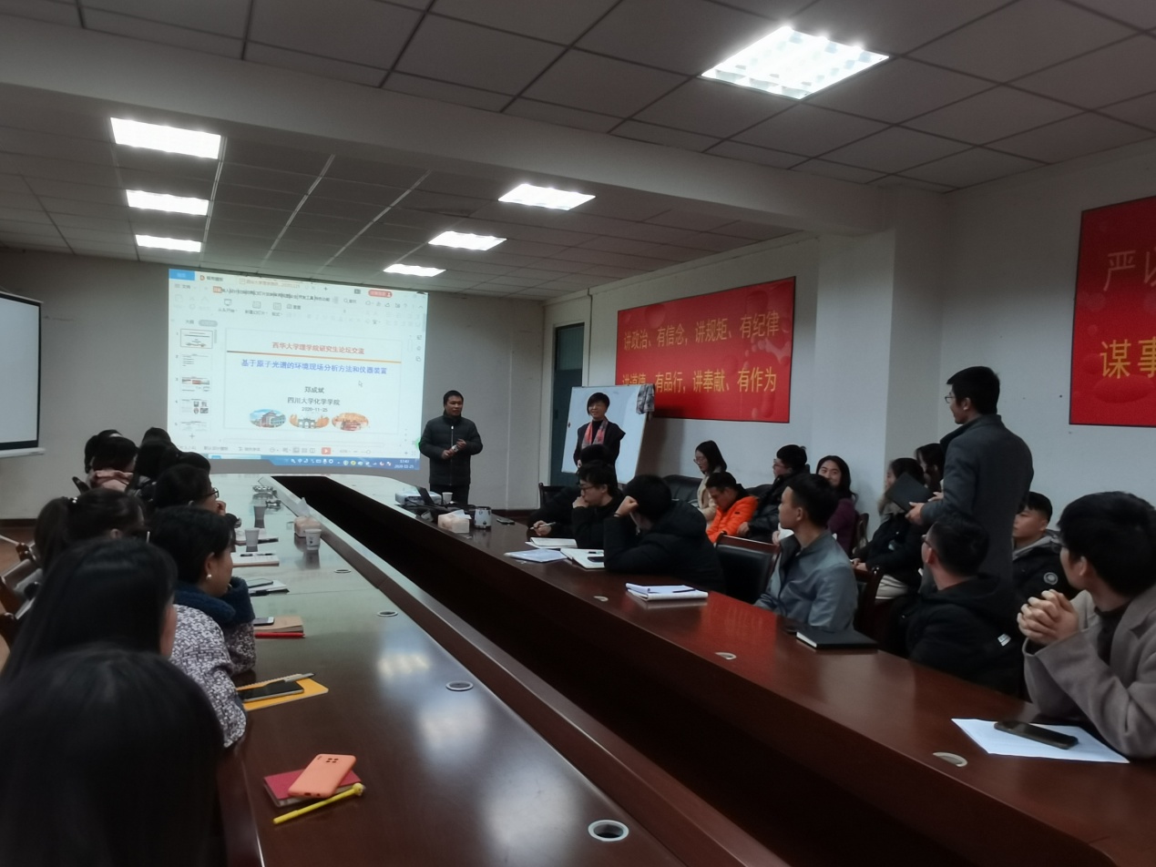 郑成斌教授从当前面对的环境污染问题出发,引出了环境中重金属离子现场检测和分析所面临的困难。针对这些困难,郑教授的课题组开启了基于原子光谱的便携式现场分析仪的探究之路,并取得了优异成果。郑成斌教授提到原子光谱作为金属离子微量、痕量检测最重要的手段之一,但其高能耗、高气体消耗却限制了原子光谱微型化,为了解决这一问题,他们创新性地将集成的样品通过双模式化学蒸气发生装置再激发成微等离子体,这样不仅可以提高待测样品的稳定性,还能使整体小型化,从而用于金属形态分析。同时,他们课题组沿用这个思路,结合气相色谱制得了具有实用价值的碳原子发射光谱仪(GC-DBD-C-OES)——好食机,在第六届中国国际“互联网+”大学生创新创业大赛中获得了四川省金奖、国家级银奖的好成绩。最后,郑成斌教授还给同学分享了科研过程中的经验和心得,谈到学科领域交叉融合对于科研探索的重要性。