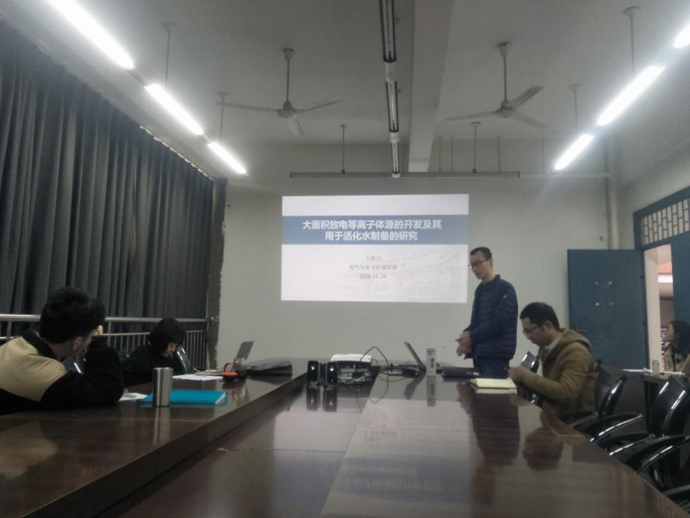 王冰川老师对他的报告“大面积放电等离子体源的开发及其用于活化水制备的研究”进行了精彩的陈述。他指出表面放电在等离子体生物医学领域具有独特的技术优势和广阔的应用前景,然而目前表面放电还存在介质材料易发热、产生的等离子体中活性粒子组分和浓度不易调控、活性粒子传质距离短、制备的活化水的灭菌机制尚不清楚等问题。因此,该报告从介质材料和装置结构两方面对表面放电源进行了优化设计,探讨了活化水的灭菌机制的建设,以期进一步解决相关问题。