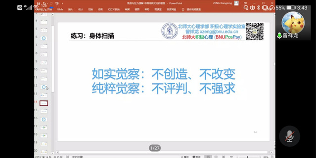 曾祥龙老师首先从中国传统文化儒、道、释的智慧展开讲解,整体概述正念冥想的思想——即注意控制当下的智慧,在日常生活中回归当下、投入当下。在开始正念冥想的详细讲述前,他询问听众此前是否有过正念冥想的学习经历,大多数老师表示未曾有过。接着,曾老师便现场引导大家进行“身体扫描”的练习,帮助个人察觉身体感受。最后,曾老师以现实生活为例,从“分心的智慧”和“接纳的智慧”两方面分别阐述接纳与改变平衡的重要性,介绍了舒缓焦虑的实际运用。