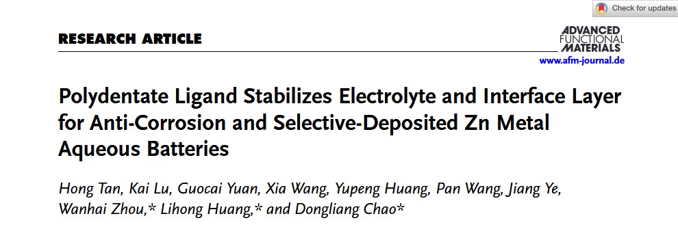 近日,材料科学与工程学院黄丽宏教授与复旦大学晁栋梁教授合作,在国际顶尖期刊《Advanced Functional Materials》上发表题为“Polydentate Ligand Stabilizes Electrolyte and Interface Layer for Anti-Corrosion and Selective-Deposited Zn Metal Aqueous Batteries”的研究论文。《Advanced Functional Materials2025年最新影响因子为18.5,是材料与化学领域的公认顶级期刊(中科院大类/小类一区Top期刊),同时被国际权威的自然指数评选为顶级期刊之一。论文通讯作者为黄丽宏教授和复旦大学晁栋梁教授,西华大学青年博士谭鸿和硕士研究生芦凯为论文的共同一作,西华大学为第一完成单位。