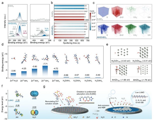 锌金属负极不可控的枝晶生长和副反应极大地阻碍了水系锌金属电池的实际应用。尽管有许多关于探索电解质添加剂以缓解上述问题的报道,但对于低浓度添加剂在吸附配置和抑制枝晶/腐蚀作用方面的构效关系却鲜有讨论。为此,黄丽宏教授团队提出了一种独特的多齿配体策略,通过使用β-Alanyl-L-histidineAH)电解质添加剂,以稳定溶剂化结构,促进锌金属负极表面成膜,提高界面耐腐蚀性,并触发(002)晶面选择性沉积,实现无枝晶锌负极和锌金属电池循环稳定性的有效提升。