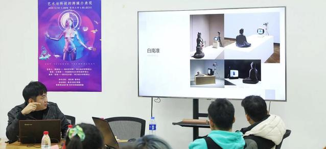 魏豪彤和徐韦毕业于四川美术学院,他们在研究生毕业之后,一直从事艺术与科技相关领域工作,完成了大量实验装置艺术作品。讲座伊始,魏老师针对新媒体、跨媒介、先锋艺术家进行了系统的介绍,让同学们全方位了解艺术与科技的结合之美,并将其在不同领域的应用作了阐释。魏老师通过解析Vedio艺术之父白南准的作品,引出自己对于艺术与科技碰撞的见解,针对个人作品的策划与创作过程作了较全面的介绍,同学们从中获益匪浅。