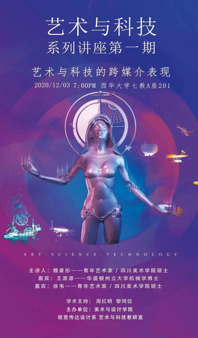 12月3日晚19:00,美术与设计学院在艺术大楼A座201A成功举办了设计类专业导论暨艺术与科技的跨媒介表现讲座活动。此次活动特别邀请到艺术与科技领域的艺术家魏豪彤老师、徐韦老师以及毕业于华盛顿州立大学王源源博士,为学院2020级艺术与科技全体新生讲授。讲座由学院视觉传达设计系艺术与科技教研室承办,教研室全体教师参与此次讲座,并与先锋艺术家们一同探讨艺术与科技的发展现状与未来前景。据悉,本次活动是艺术与科技系列讲座的第一期,由周红明老师、黎珂位老师担任学术主持。